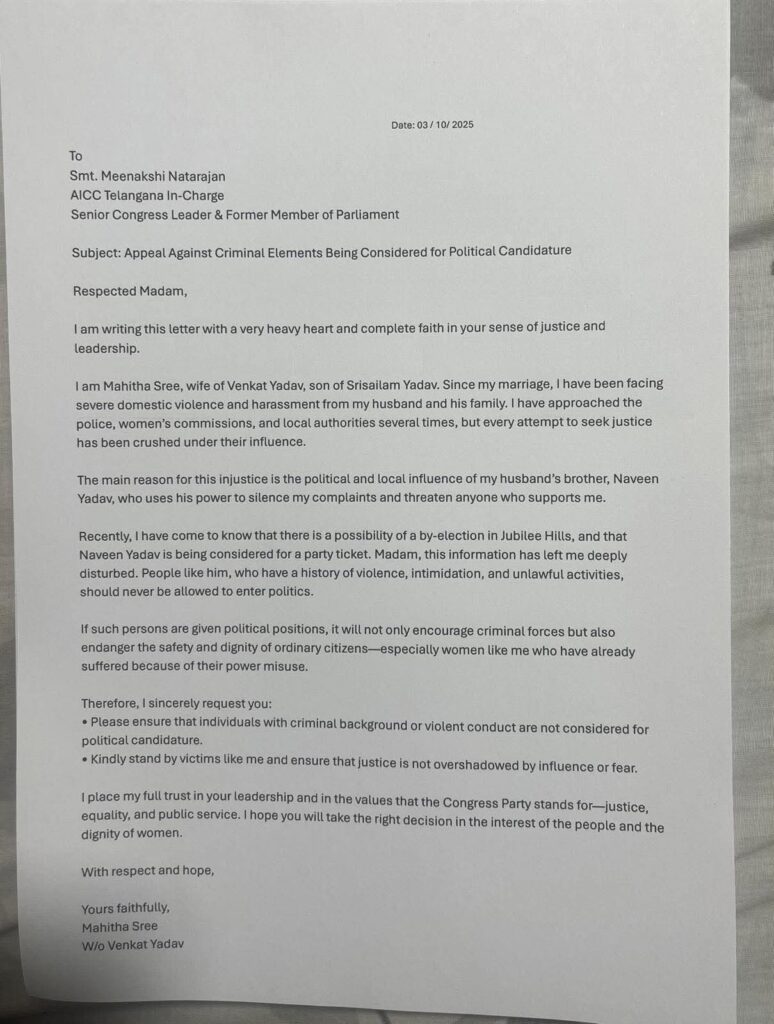 ఇటీవల, జూబ్లీహిల్స్లో ఉప ఎన్నిక వచ్చే అవకాశం ఉందని, ఆ ఉప ఎన్నికలో నవీన్ యాదవ్ను పార్టీ టిక్కెట్ కోసం పరిశీలిస్తున్నారని నాకు తెలిసింది. మేడమ్, ఈ సమాచారం నన్ను తీవ్రంగా కలచివేసింది. హింస, బెదిరింపు మరియు చట్టవిరుద్ధ కార్యకలాపాల చరిత్ర కలిగిన ఆయన వంటి వ్యక్తులను రాజకీయాల్లోకి అనుమతించకూడదు.